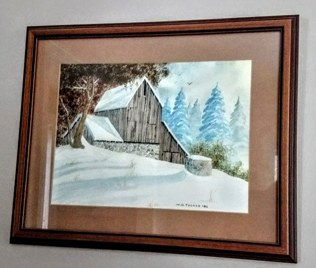 On the wall to my right hangs two things that bring me delight. One is the picture that my Dad painted for me, a scene of a barn in winter. The trees behind the barn are blue; it’s the snow that robbed them of their greenery, and they stand there like frozen sentinels of winter’s beauty. There is a bird in the air. I wonder how it can keep from freezing in the polar atmosphere.