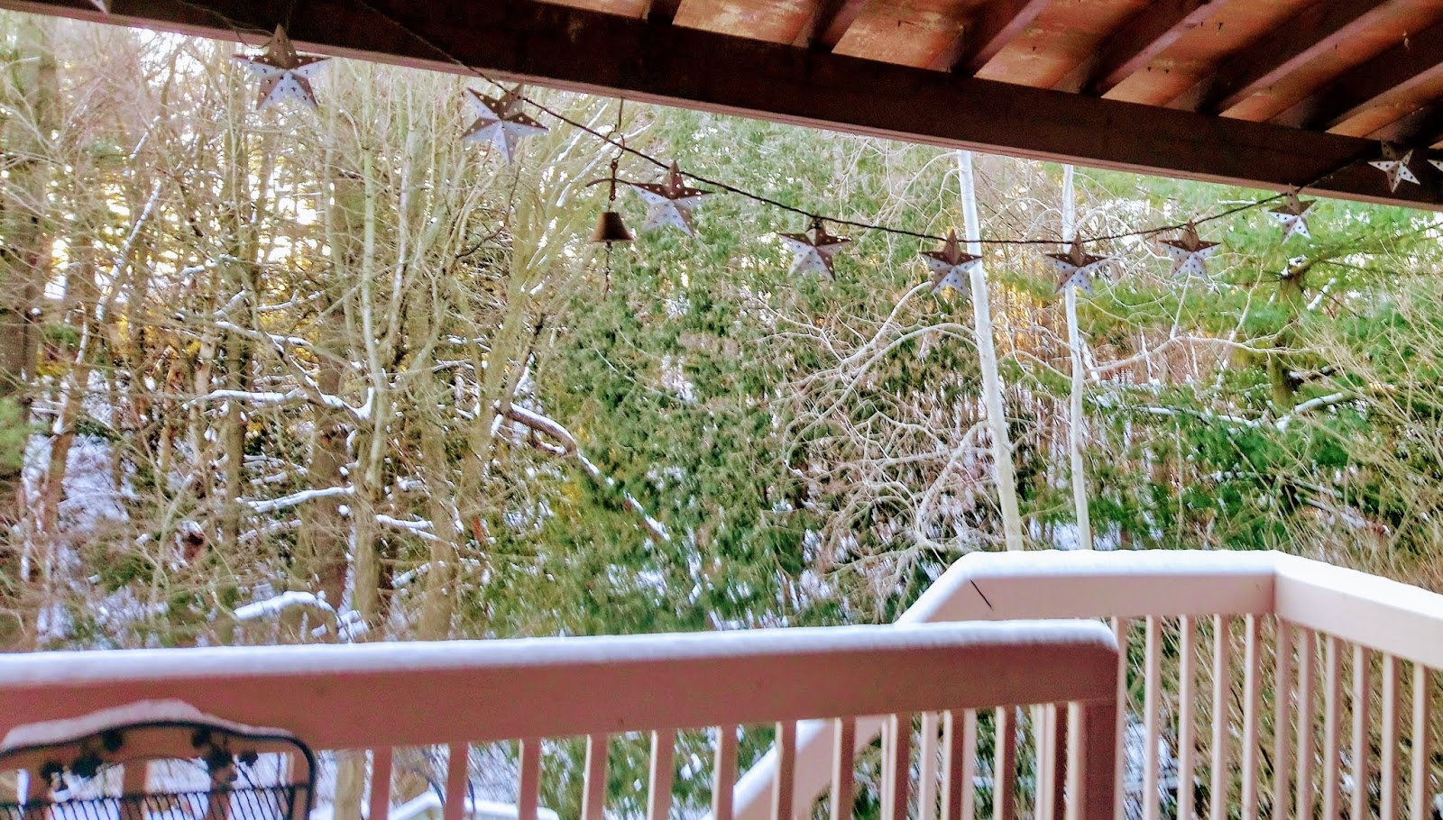 The sun is streaming through the trees outside of the kitchen sliding glass doors, and snow has fallen fresh on the deck and the ground — and shadows streak across the floor.