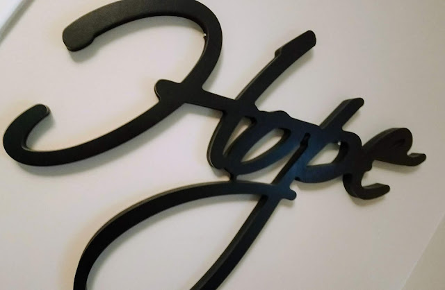 The other is a graphic of the word, HOPE. It is large and swoops its letters in a curly-qu, like cursive writing. It is a word I live my life by, the anchor in storms that come my way. Essential, vital, a word that strengthens and gives encouragement, and the ability to carry on yet another day.